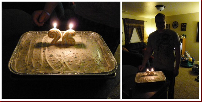 In order to make up for moving on his birthday-again, my family and I went all out to make sure it would be a birthday to remember! I let him open presents the night before his birthday, made him breakfast the day of, and then my mom and I threw a huge birthday bash for him at my parent’s with his family and mine, and then if that was not enough I threw him another party with my grandparents. I think it is safe to say he had a good 26th birthday! I mean who can complain with two birthday cakes? :)
